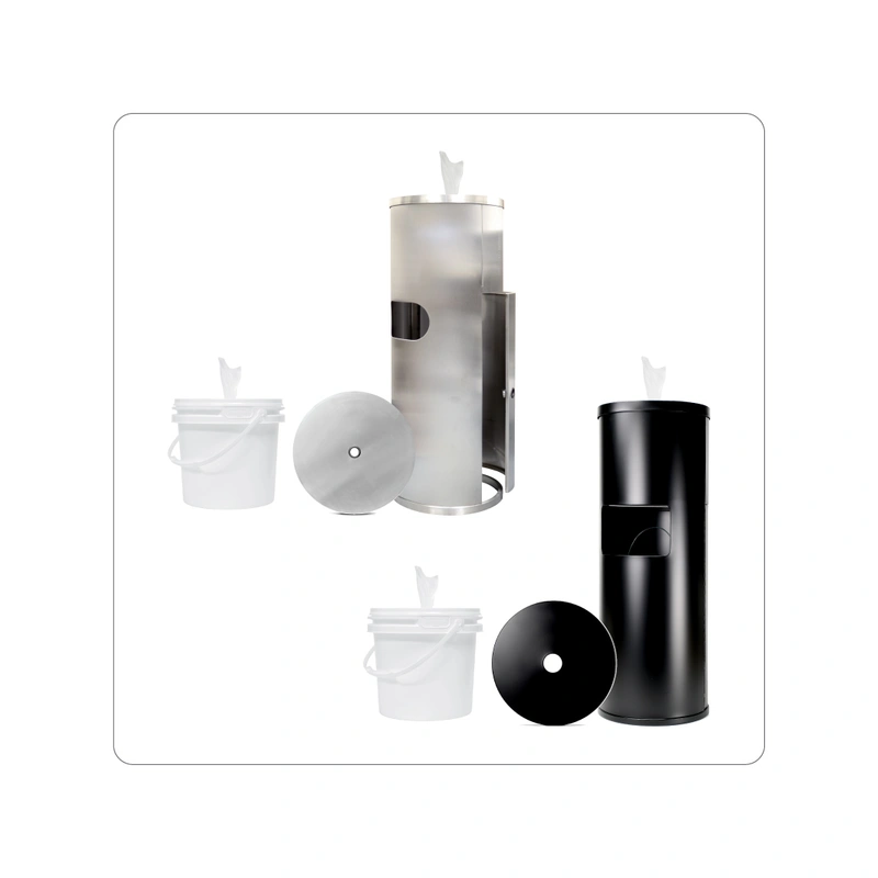 Professional Stainless Steel or Black Dispenser for wipes with trash receptacle at bottom.